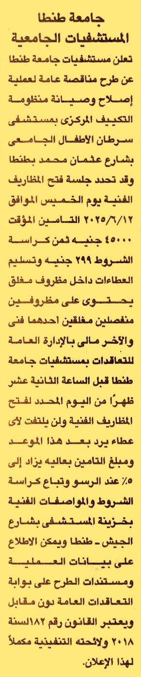 HOT Information مناقصة عامة لعملية إصلاح وصيانة منظومة التكييف المركزي بمستشفى سرطان الأطفال الجامعي بشارع عثمان محمد بطنطا عن جريدة الجمهورية Post navigation مستشفى معهد الكبد القومي شركة البحيرة لتوزيع الكهرباء