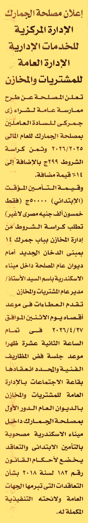 HOT Information مناقصة عامة لعملية توريد زي جمركي للسادة العاملين بالمصلحة عن جريدة الأخبار Post navigation مكتبة الإسكندرية نقابة المهن الزراعية بالبحيرة