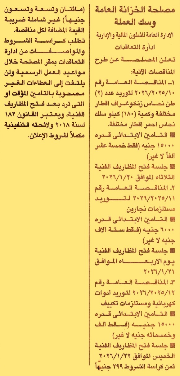 HOT Information مناقصة عامة رقم 10/2025/2026 لعملية توريد عدد 2 طن نحاس زنكوغراف أقطار مختلفة وكمية 180 كيلو سلك نحاس أحمر أقطار مختلفة عن جريدة الجمهورية Post navigation رئاسة مركز ومدينة التل الكبير نادي السكة الحديد بالإسماعيلية