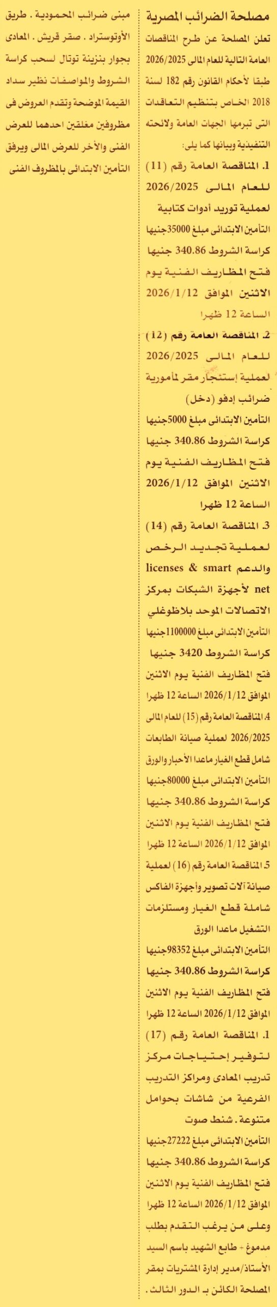 HOT Information مناقصة عامة رقم 11/2025/2026 لعملية توريد أدوات كتابية عن جريدة الأهرام Post navigation مؤسسة مستشفى أورام الأطفال 57357 جهاز تنمية مدينة أسوان الجديدة