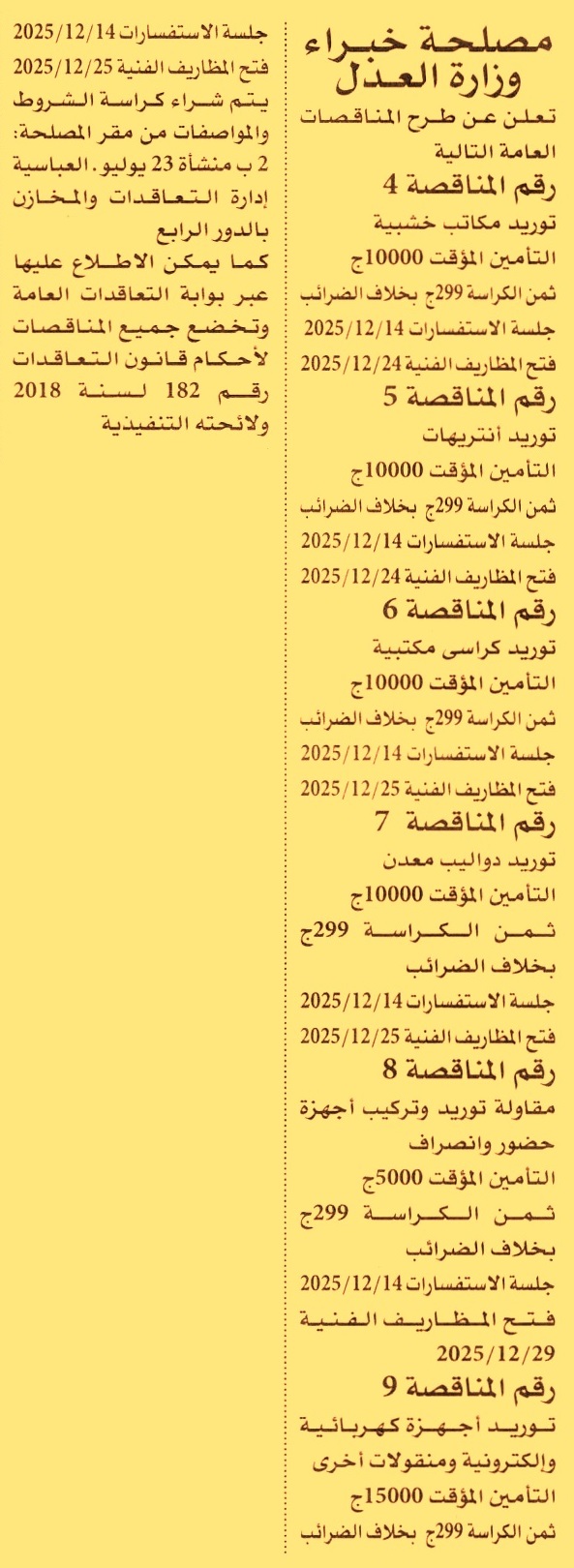 HOT Information مناقصة عامة رقم 4 لعملية توريد مكاتب خشبية (جلسة الاستفسارات يوم 14/12/2025) عن جريدة الأهرام Post navigation الشركة المصرية للمطارات مستشفيات جامعة المنيا