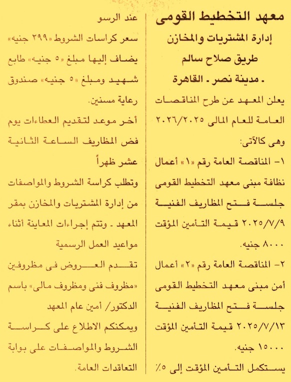 HOT information مناقصة عامة رقم 1/2025/2026 لعملية تنفيذ أعمال نظافة مبنى معهد التخطيط القومي عن جريدة الجمهورية Post navigation شركة مياه الشرب والصرف الصحي بالمنيا هيئة ميناء دمياط