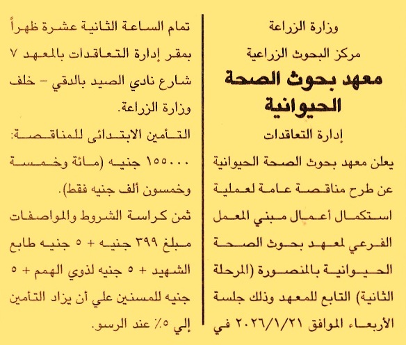 HOT information مناقصة عامة لعملية استكمال أعمال مبنى المعمل الفرعي للمعهد بالمنصورة “المرحلة الثانية” عن جريدة الجمهورية Post navigation الجمعية التعاونية المشتركة للإصلاح الزراعي بأبيس الهيئة المصرية العامة للمعارض والمؤتمرات