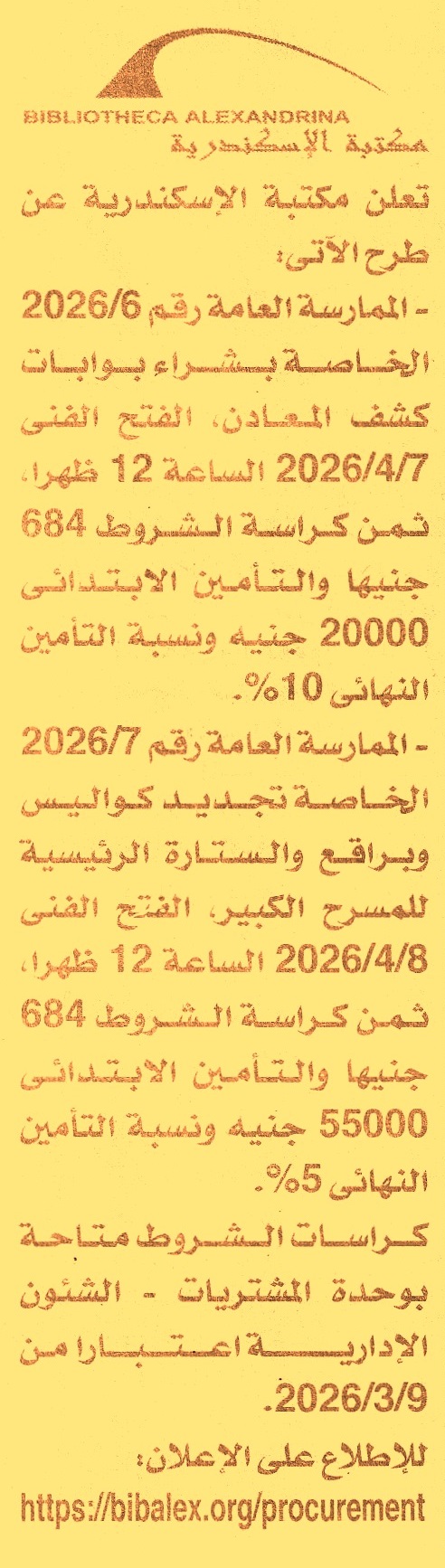HOT information ممارسة عامة رقم 6/2026 لعملية توريد بوابات كشف المعادن عن جريدة الأخبار Post navigation الهيئة القومية لسكك حديد مصر الهيئة العامة للاستثمار والمناطق الحرة
