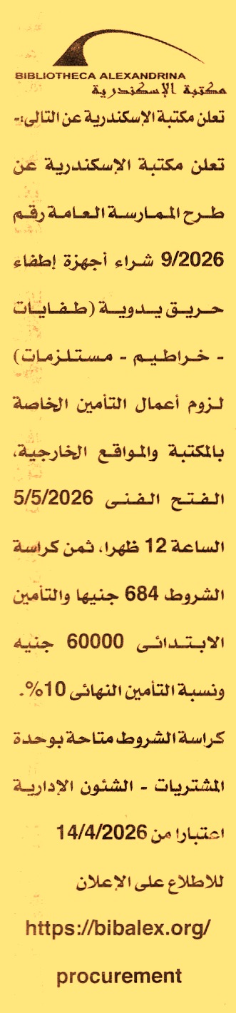 HOT Information ممارسة عامة رقم 9/2026 لعملية توريد أجهزة إطفاء حريق يدوية “طفايات, خراطيم, مستلزمات” لزوم أعمال التأمين الخاصة بالمكتبة والمواقع الخارجية (تباع الكراسة من يوم 14/4/2026) عن جريدة الأخبار Post navigation نادي الجمهورية الرياضي بشبين الكوم مصلحة الجمارك