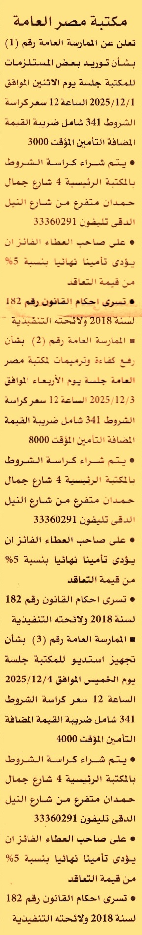 HOT Information ممارسة عامة رقم 1 لعملية توريد بعض المستلزمات للمكتبة عن جريدة الأهرام Post navigation جمعية رسالة للأعمال الخيرية الشركة المصرية للاتصالات