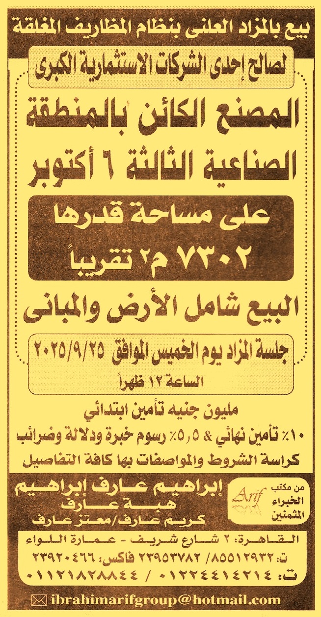 HOT Information مزايدة علنية لعملية بيع مصنع على مساحة 7302م2 تقريبا الكائن بالمنطقة الصناعية الثالثة – 6 أكتوبر “البيع شامل الأرض والمباني” عن جريدة الأخبار Post navigation نادي بهتيم الرياضي شركة جنوب الدلتا لتوزيع الكهرباء