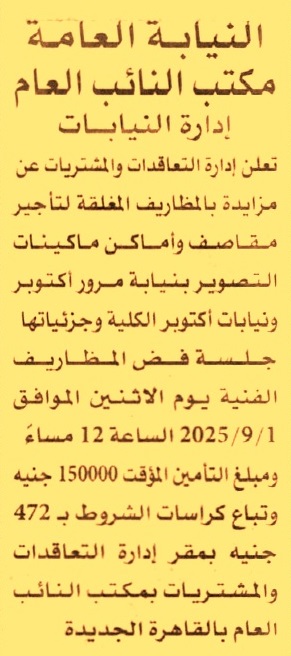 HOT Information مزايدة عامة لعملية تأجير مقاصف وأماكن ماكينات التصوير بنيابة مرور أكتوبر ونيابات أكتوبر الكلية وجزئياتها عن جريدة الأهرام Post navigation شركة مياه الشرب والصرف الصحي بالبحيرة مركز شباب الإبراهيمية القبلية بدمياط
