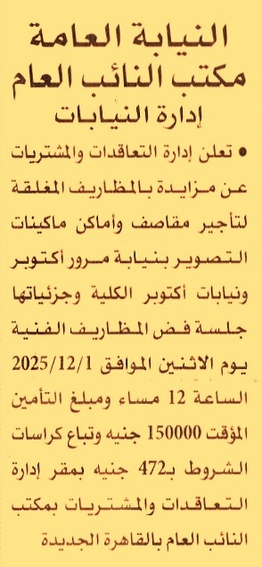 HOT Information مزايدة عامة لعملية تأجير مقاصف وأماكن ماكينات التصوير بنيابة مرور أكتوبر ونيابات أكتوبر الكلية وجزئياتها عن جريدة الأهرام Post navigation محافظة الدقهلية الإدارة العامة لري غرب قنا