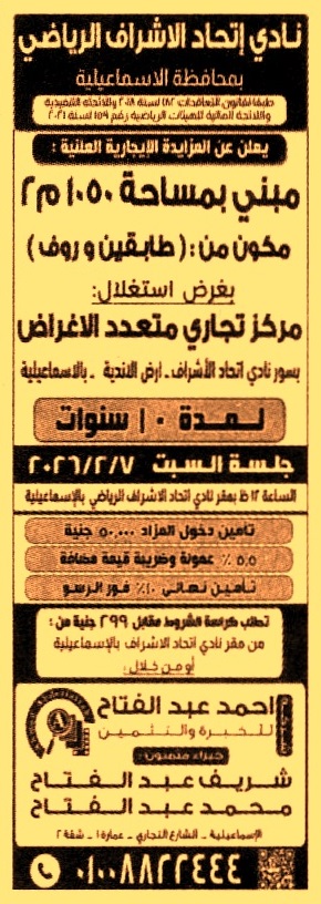 HOT Information مزايدة علنية لعملية تأجير مبنى بمساحة 1050م2 مكون من طابقين وروف بغرض استغلال مركز تجاري متعدد الأغراض بسور النادي بنظام حق الإنتفاع لمدة 10 سنوات عن جريدة الجمهورية Post navigation محافظة السويس شركة مضارب الشرقية