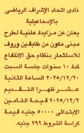 HOT Information مزايدة علنية لعملية تأجير مبنى مكون من طابقين وروف للاستثمار بنظام حق الإنتفاع لمدة 10 سنوات عن جريدة الجمهورية Post navigation محافظة الغربية مركز شباب سيف الدين بدمياط