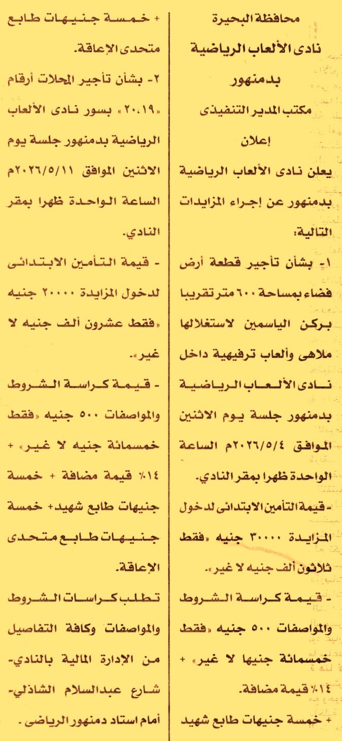 HOT Information مزايدة علنية عامة لعملية تأجير قطعة أرض فضاء بمساحة 600م تقريبا بركن الياسمين لاستغلالها ملاهي وألعاب ترفيهية داخل النادي (تعاد الجلسة أسبوعيا حتى إتمام الرسو) عن جريدة الأخبار Post navigation محافظة دمياط مركز شباب شطورة