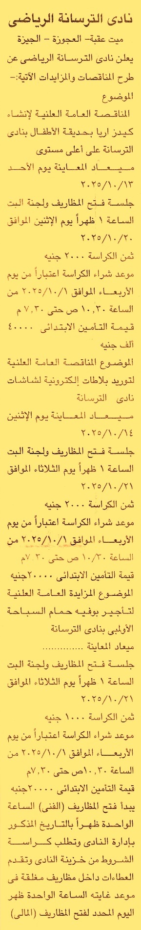 HOT information مناقصة عامة لعملية إنشاء كيدز اريا بحديقة الأطفال بنادي الترسانة على أعلى مستوى (تباع الكراسة ابتداء من يوم 1/10/2025 الساعة 10:30 ص حتى 7:30 م وجلسة المعاينة يوم 13/10/2025) عن جريدة الجمهورية Post navigation الإدارة العامة لمشروعات الصرف بوسط الدلتا مدينة مصيف بلطيم