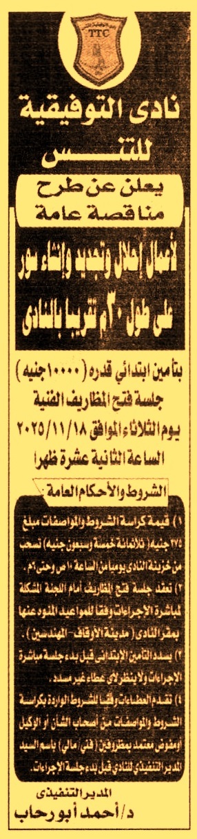 HOT Information مناقصة عامة لعملية إحلال وتجديد وإنشاء سور على طول 30م تقريبا بالنادي (العملية قابلة للتجزئة وتباع الكراسة يوميا من الساعة 10 ص حتى 6 م) عن جريدة الجمهورية Post navigation شركة مياه الشرب والصرف الصحي بالمنيا جهاز تنمية مدينة 6 أكتوبر