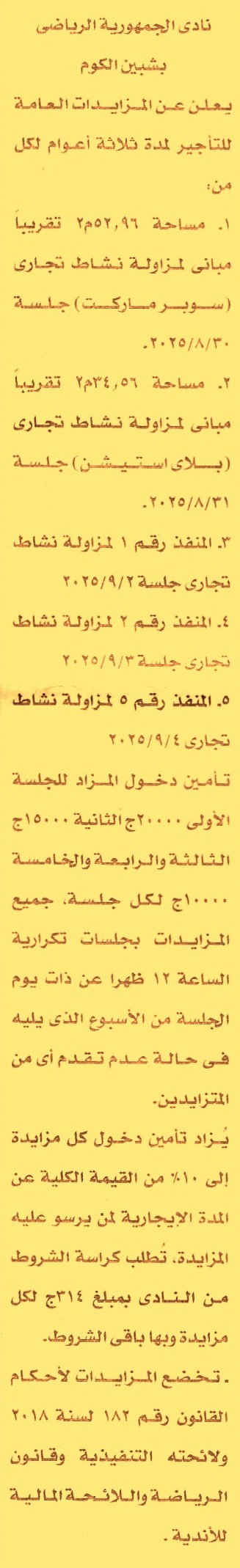 HOT Information مزايدة عامة لعملية تأجير مساحة مباني 52.96م2 تقريبا لمزاولة نشاط تجاري “سوبر ماركت” لمدة 3 سنوات (تعاد الجلسة في ذات اليوم من الأسبوع الذي يليه في حالة عدم الرسو) عن جريدة الأخبار Post navigation مركز التنمية الشبابية بزينهم جامعة مدينة السادات