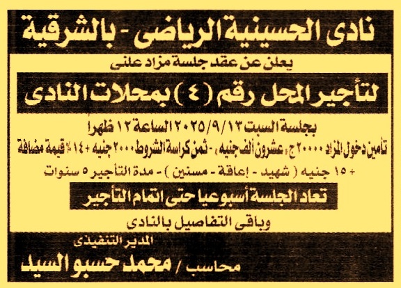 HOT Information مزايدة علنية لعملية تأجير المحل رقم 4 بمحلات النادي لمدة 5 سنوات (تعاد الجلسة أسبوعيا حتى إتمام الرسو) عن جريدة الجمهورية Post navigation مركز شباب خرطة عاصم المركز الرياضي لتدريب الفرق القومية بالمعادي