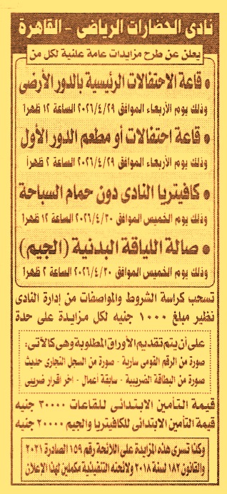HOT Information مزايدة علنية عامة لعملية تأجير قاعة الاحتفالات الرئيسي بالدور الأرضي (يرفق مع المستندات سابقة أعمال وأخر إقرار ضريبي وصورة من الرقم القومي) عن جريدة الأخبار Post navigation بنك المؤسسة العربية المصرفية جامعة سوهاج