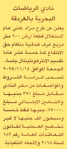 HOT information مزايدة علنية عامة لعملية إستغلال قطعة أرض 600م2 غرف فندقية تقسيم الانتركونتيننتال بنظام حق الإنتفاع لمد 15 سنة عن جريدة الجمهورية Post navigation مركز التنمية الشبابية بقويسنا – محافظة المنوفية مطلوب على وجه السرعة
