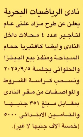 HOT Information مزايدة علنية عامة لعملية تأجير عدد 4 محلات داخل النادي وأيضا كافتيريا حمام السباحة ومنفذ بيع البيتزا والحلواني عن جريدة الجمهورية Post navigation مركز البحوث الزراعية مركز شباب الشيبه بالشرقية
