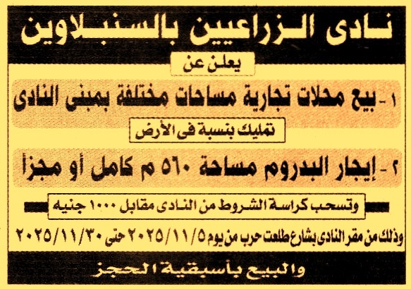 HOT information مزايدة عامة لعملية بيع محلات تجارية مساحات مختلفة تمليك بنسبة في الأرض وتأجير البدروم بمساحة 560م كامل أو مجزأ (تسحب الكراسة من يوم 5/11/2025 حتى يوم 30/11/2025 والبيع بأسبقية الحجز) عن جريدة الجمهورية Post navigation الإدارة العامة للتوسع الأفقي والمشروعات بإسنا وزارة المالية