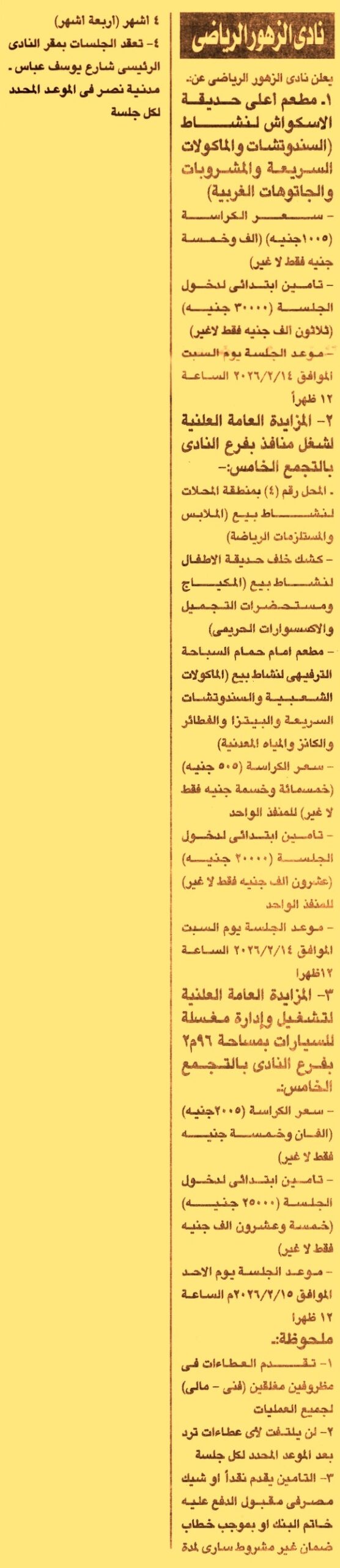 HOT Information مزايدة علنية عامة لعملية تأجير مطعم أعلى حديقة الاسكواش لنشاط “السندوتشات والمأكولات السريعة والمشروبات والجاتوهات الغربية” (مدة سريان خطاب الضمان 4 أشهر) عن جريدة الجمهورية Post navigation الجمعية المركزية للإصلاح الزراعي الوحدة المحلية لمدينة سفاجا