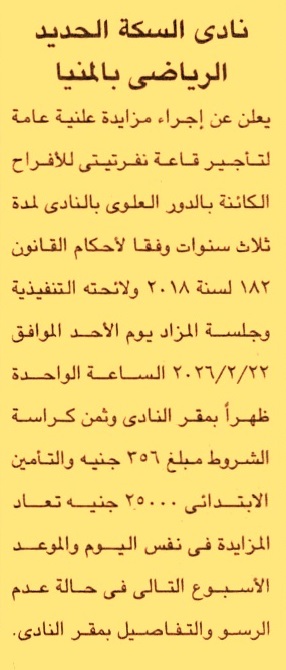 HOT Information مزايدة علنية عامة لعملية تأجير قاعة أفراح نفرتيتي للأفراح الكائنة بالدور العلوي للنادي لمدة 3 سنوات (تعاد الجلسة أسبوعيا حتى إتمام الرسو) عن جريدة الجمهورية Post navigation نادي قارون الرياضي
