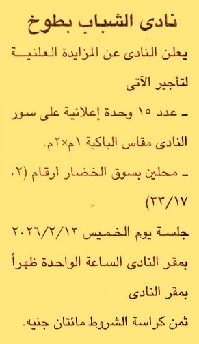 HOT Information مزايدة علنية لعملية تأجير عدد 15 وحدة إعلانية على سور النادي مقاس الباكية 1م×2م ومحلين بسوق الخضار أرقام “2, 17/33” عن جريدة الجمهورية Post navigation جهاز تنمية مدينة المنيا الجديدة جهاز تنمية مدينة 6 أكتوبر