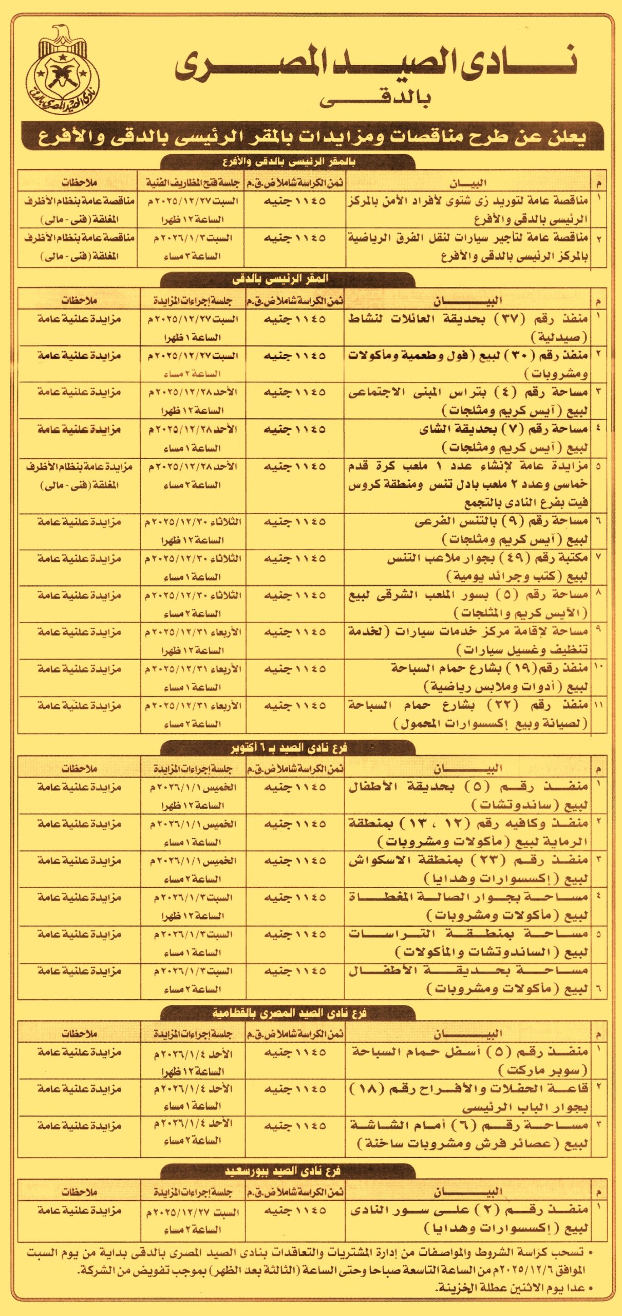 HOT Information مناقصة عامة لعملية توريد زي شتوي لأفراد الأمن بالمركز الرئيسي بالدقي والأفرع (تسحب كراسة الشروط من الساعة 9 ص حتى 3 ظ عدا يوم الاثنين) عن جريدة الأهرام Post navigation جمعية المصدرين المصريين مركز التنمية الشبابية بالجزيرة