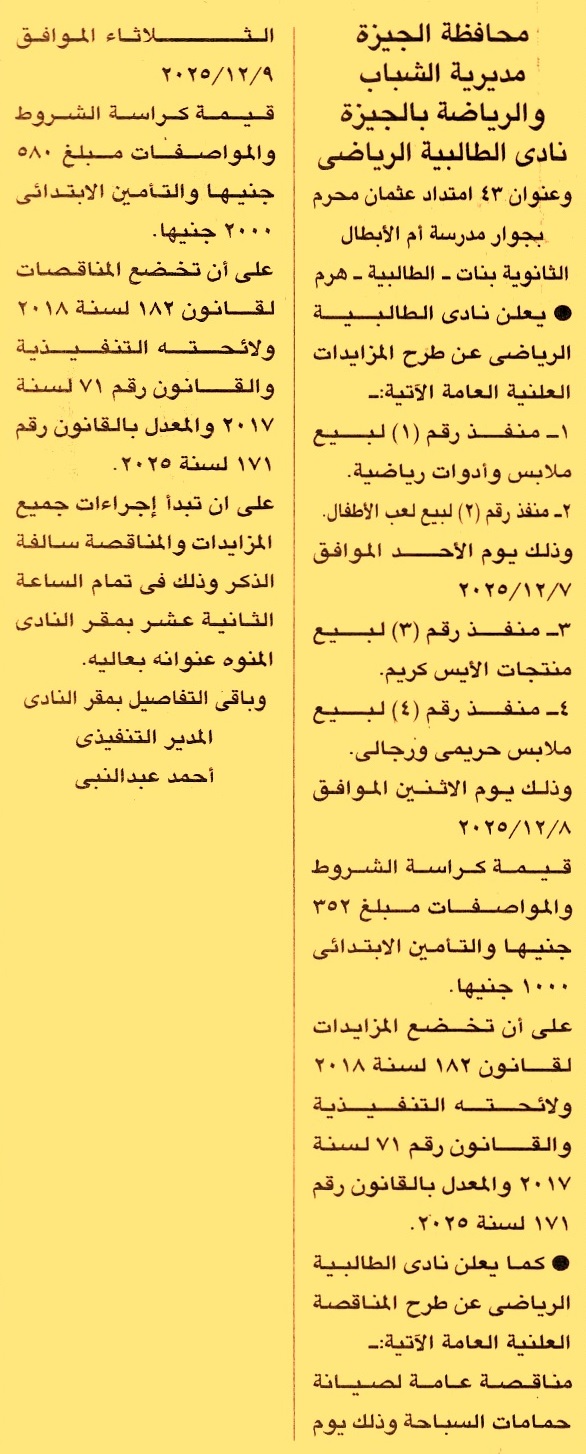 HOT Information مزايدة علنية عامة لعملية تأجير الأتي (1) منفذ رقم 1 لبيع ملابس وأدوات رياضية (2) منفذ رقم 2 لبيع لعب الأطفال عن جريدة الجمهورية Post navigation مديرية الصحة بالقليوبية جامعة المنصورة