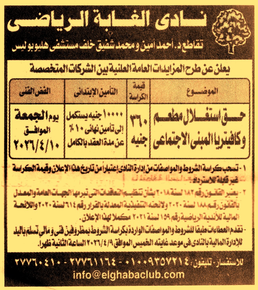 HOT Information مزايدة علنية عامة لعملية حق استغلال مطعم وكافتيريا المبنى الاجتماعي (أخر موعد لتقديم العطاءات يوم 9/4/2026) عن جريدة الجمهورية Post navigation جامعة طنطا محكمة القاهرة الاقتصادية