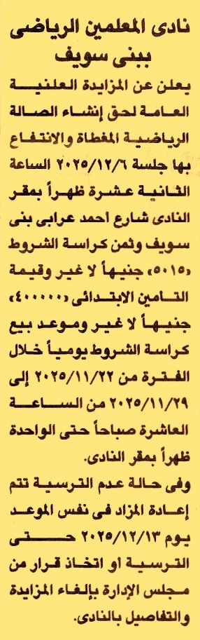 HOT Information مزايدة علنية عامة لعملية إنشاء الصالة الرياضية المغطاة وحق الإنتفاع بها (تباع الكراسة في الفترة من يوم 22/11/2025 حتى يوم 29/11/2025 من الساعة 10 ص حتى 1 ظ وتعاد الجلسة يوم 13/12/2025 في حالة عدم الرسو) عن جريدة الجمهورية Post navigation شركة الدقهلية لصناعة وتكرير السكر الهيئة القومية لسكك حديد مصر