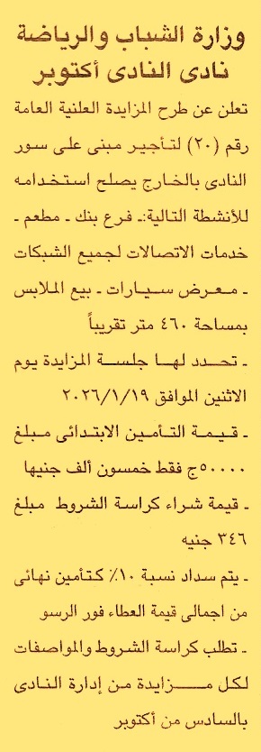 HOT Information مزايدة علنية عامة رقم 20 لعملية تأجير مبنى على سور النادي بالخارج بمساحة 460م تقريبا يصلح استخدامه للأنشطة التالية “فرع بنك, مطعم, خدمات الاتصالات لجميع الشبكات, معرض سيارات, بيع الملابس” عن جريدة الجمهورية Post navigation محافظة الدقهلية الجمعية التعاونية للبناء والإسكان للعاملين بمديرية وهيئة الأوقاف المصرية بالقليوبية