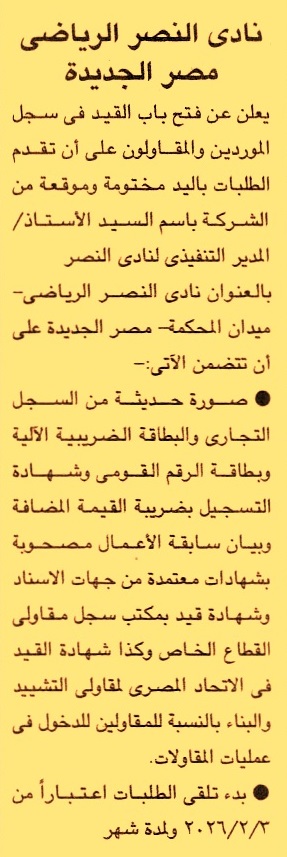 HOT Information فتح باب القيد بسجل الموردين والمقاولين (تقدم الطلبات من يوم 3/2/2026 ولمدة شهر) عن جريدة الجمهورية Post navigation شركة النيل الوطنية للنقل النهري