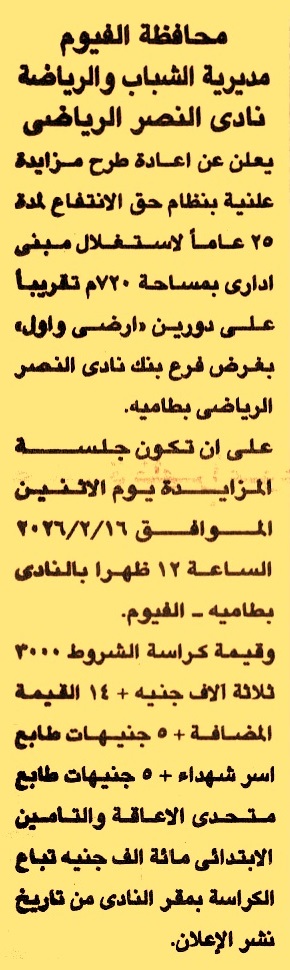 HOT Information إعادة مزايدة علنية لعملية استغلال مبنى اداري بمساحة 720م تقريبا على دورين “أرضي وأول” بغرض فرع بنك نادي النصري الرياضي بطامية عن جريدة الجمهورية Post navigation مدينة الأبحاث العلمية والتطبيقات التكنولوجية النادي الأهلي للرياضة البدنية