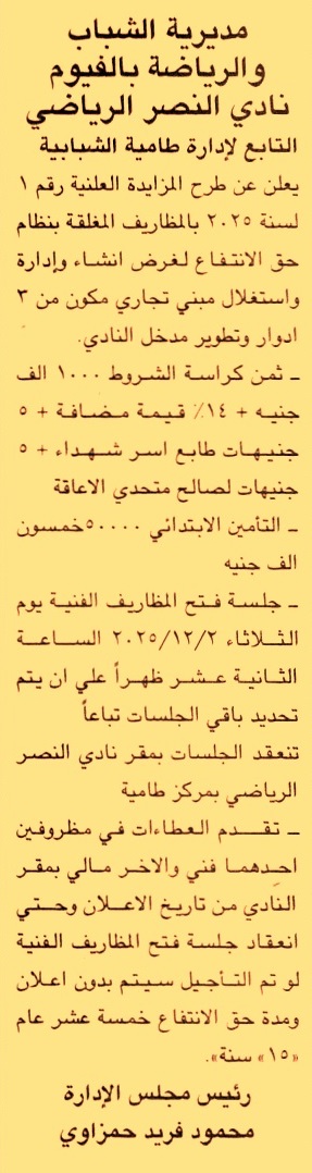 HOT Information مزايدة علنية رقم 1/2025 لعملية إنشاء وإدارة واستغلال مبنى تجاري مكون من 3 أدوار وتطوير مدخل النادي بنظام حق الانتفاع لمدة 15 سنة عن جريدة الجمهورية Post navigation الهيئة العامة للسد العالي وخزان أسوان وزارة الصحة والسكان