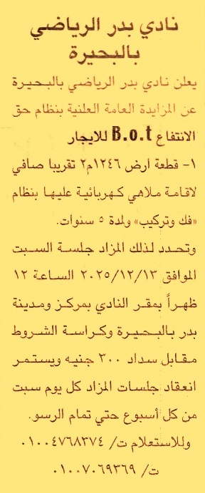 HOT Information مزايدة علنية عامة لعملية تأجير قطعة أرض بمساحة 1246م2 تقريبا صافي لإقامة ملاهي كهربائية عليها بنظام “فك وتركيب” بنظام حق الإنتفاع لمدة 5 سنوات (تعاد الجلسة أسبوعيا حتى إتمام الرسو) عن جريدة الجمهورية Post navigation الوحدة المحلية لمركز ومدينة جرجا جامعة سوهاج
