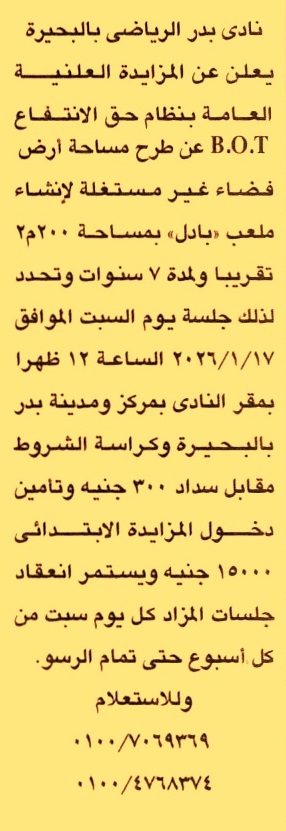 HOT information مزايدة علنية عامة لعملية تأجير قطعة أرض فضاء غير مستغلة لإنشاء ملعب بادل بمساحة 200م2 تقريبا بنظام حق الإنتفاع لمدة 7 سنوات (تعاد الجلسة أسبوعيا حتى إتمام الرسو) عن جريدة الجمهورية Post navigation هيئة ميناء دمياط الشركة البورسعيدية للأعمال الهندسية والإنشاءات البحرية