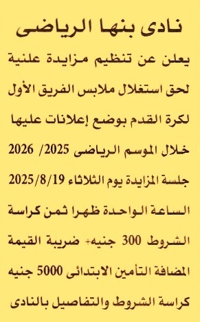 HOT Information مزايدة علنية لعملية حق استغلال ملابس الفريق الأول لكرة القدم بوضع إعلانات عليها خلال الموسم الرياضي 2025/2026 عن جريدة الأهرام Post navigation الجمعية المصرية لدعم الأطباء وتنمية المجتمع شركة السكر والصناعات التكاملية المصرية