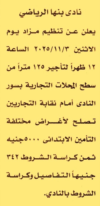 HOT information مزايدة علنية لعملية تأجير 125م من سطح المحلات التجارية بسور النادي أمام نقابة التجاريين تصلح لأغراض مختلفة عن جريدة الأخبار Post navigation جامعة الزقازيق نادي بنها الرياضي