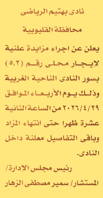 HOT Information مزايدة علنية لعملية تأجير محلي رقم 2, 5 بسور النادي الناحية الغربية عن جريدة الأخبار Post navigation وزارة الصحة والسكان شركة مصر للبترول