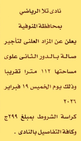 HOT Information مزايدة علنية لعملية تأجير صالة بالدور الثاني علوي بمساحة 112م تقريبا عن جريدة الأخبار Post navigation شركة المعمورة للتعمير والتنمية السياحية جامعة طنطا