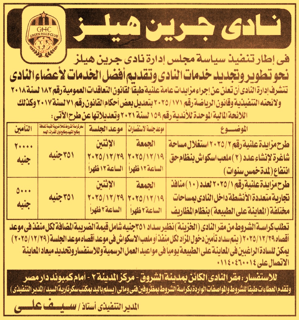 HOT Information مزايدة علنية رقم 2/2025 لعملية استغلال مساحة شاغرة لإنشاء عدد 2 ملعب اسكواش بنظام حق الإنتفاع لمدة 5 سنوات (جلسة الاستفسارات يوم 19/12/2025) عن جريدة الجمهورية Post navigation الوحدة المحلية لمدينة القصير