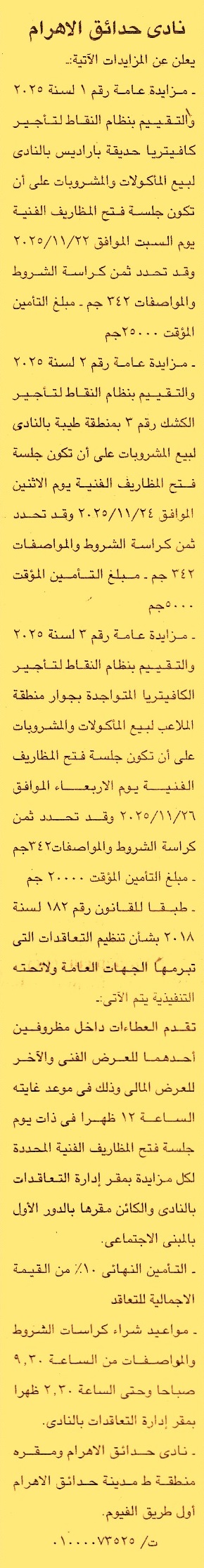 HOT Information مزايدة عامة رقم 1/2025 لعملية تأجير كافتيريا حديقة باراديس بالنادي لبيع المأكولات والمشروبات (سيتم التقييم بنظام النقاط) عن جريدة الجمهورية Post navigation رئاسة مركز ومدينة المنزلة شركة قنا لصناعة الورق