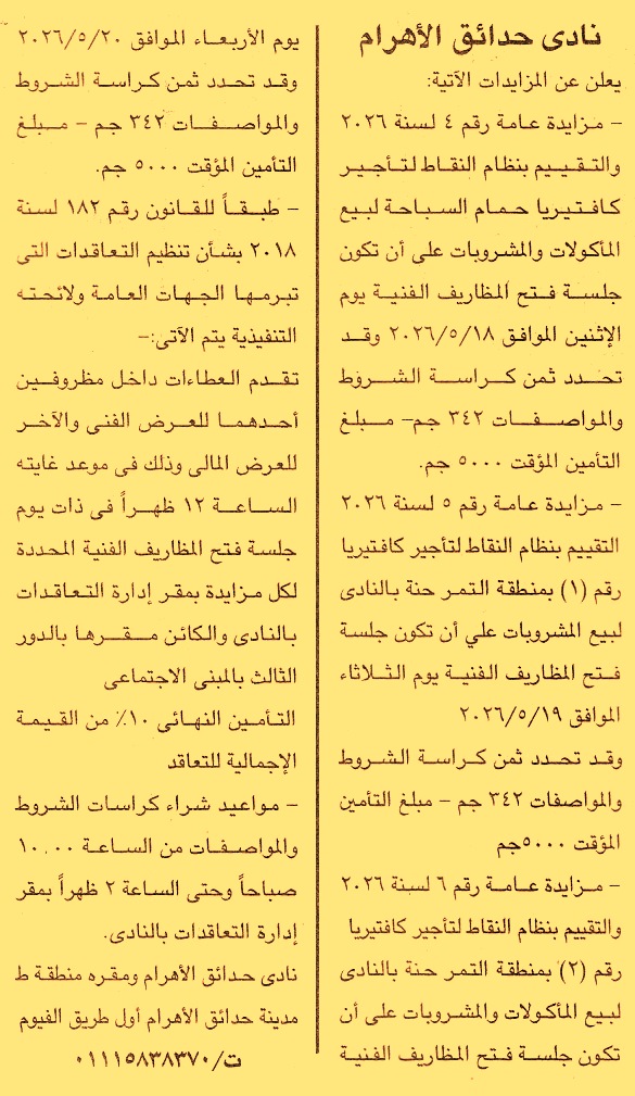 HOT information مزايدة عامة رقم 4/2026 لعملية تأجير كافتيريا حمام السباحة لبيع المأكولات والمشروبات (التقييم بنظام النقاط) عن جريدة الجمهورية Post navigation نادي النادي 6 أكتوبر محكمة القاهرة الاقتصادية