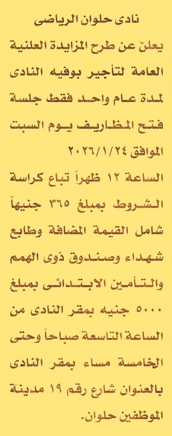 HOT Information مزايدة علنية عامة لعملية تأجير بوفيه النادي لمدة عام واحد عن جريدة الأخبار Post navigation بنك مصر وزارة الصحة والسكان
