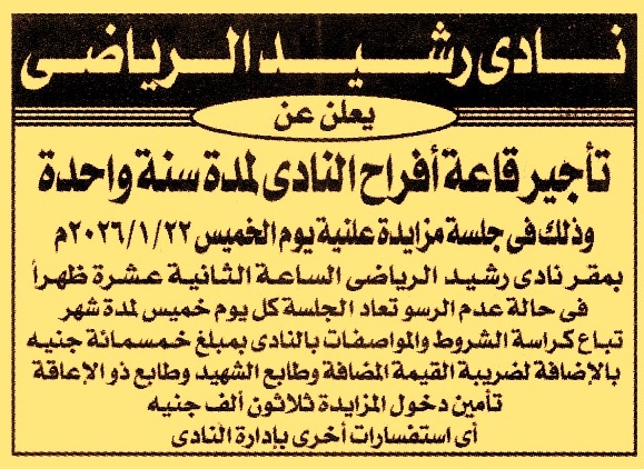 HOT Information مزايدة علنية لعملية تأجير قاعة أفراح النادي لمدة سنة (تعاد الجلسة كل يوم خميس لمدة شهر في حالة عدم الرسو) عن جريدة الجمهورية Post navigation وزارة الاتصالات وتكنولوجيا المعلومات جهاز شئون البيئة