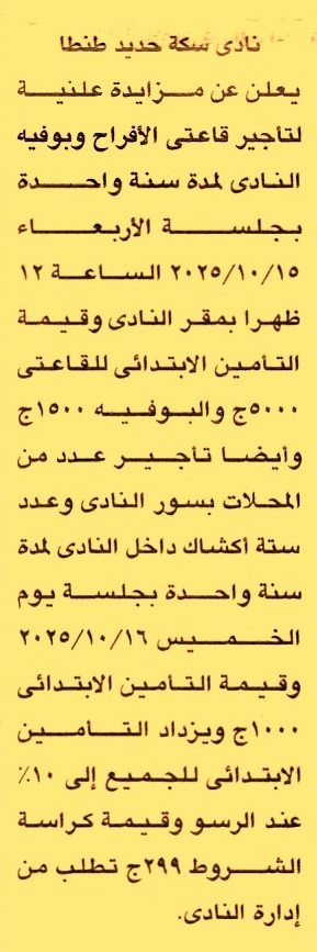 HOT information مزايدة علنية لعملية تأجير قاعتي الأفراح وبوفيه النادي لمدة سنة عن جريدة الجمهورية Post navigation شركة الغازات البترولية مركز شباب دملو ببنها
