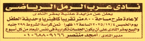 HOT information إعادة مزايدة علنية لعملية تأجير مساحة 800م تقريبا كافتيريا وحديقة الطفل (تعاد الجلسة أسبوعيا حتى إتمام الرسو) عن جريدة الجمهورية Post navigation محافظة سوهاج معهد بحوث وقاية النباتات