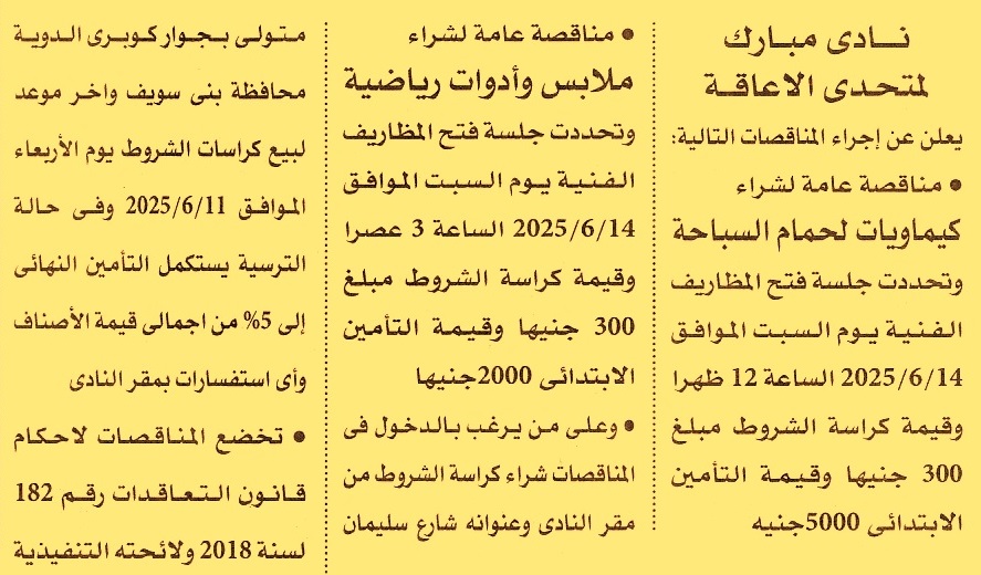HOT Information مناقصة عامة لعملية توريد كيماويات لحمام السباحة (أخر موعد لبيع الكراسة يوم 11/6/2025) عن جريدة الأهرام Post navigation وزارة التضامن الاجتماعي محافظة المنوفية