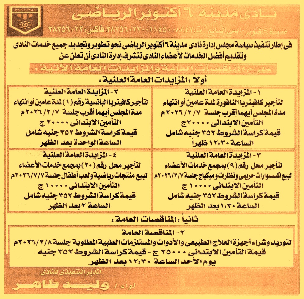 HOT Information مزايدة علنية عامة لعملية تأجير كافتيريا النافورة لمدة عامين أو انتهاء مدة المجلس عن جريدة الجمهورية Post navigation الجمعية التعاونية لأعضاء النقابة الفرعية للمعلمين بأسوان مطلوب على وجه السرعة